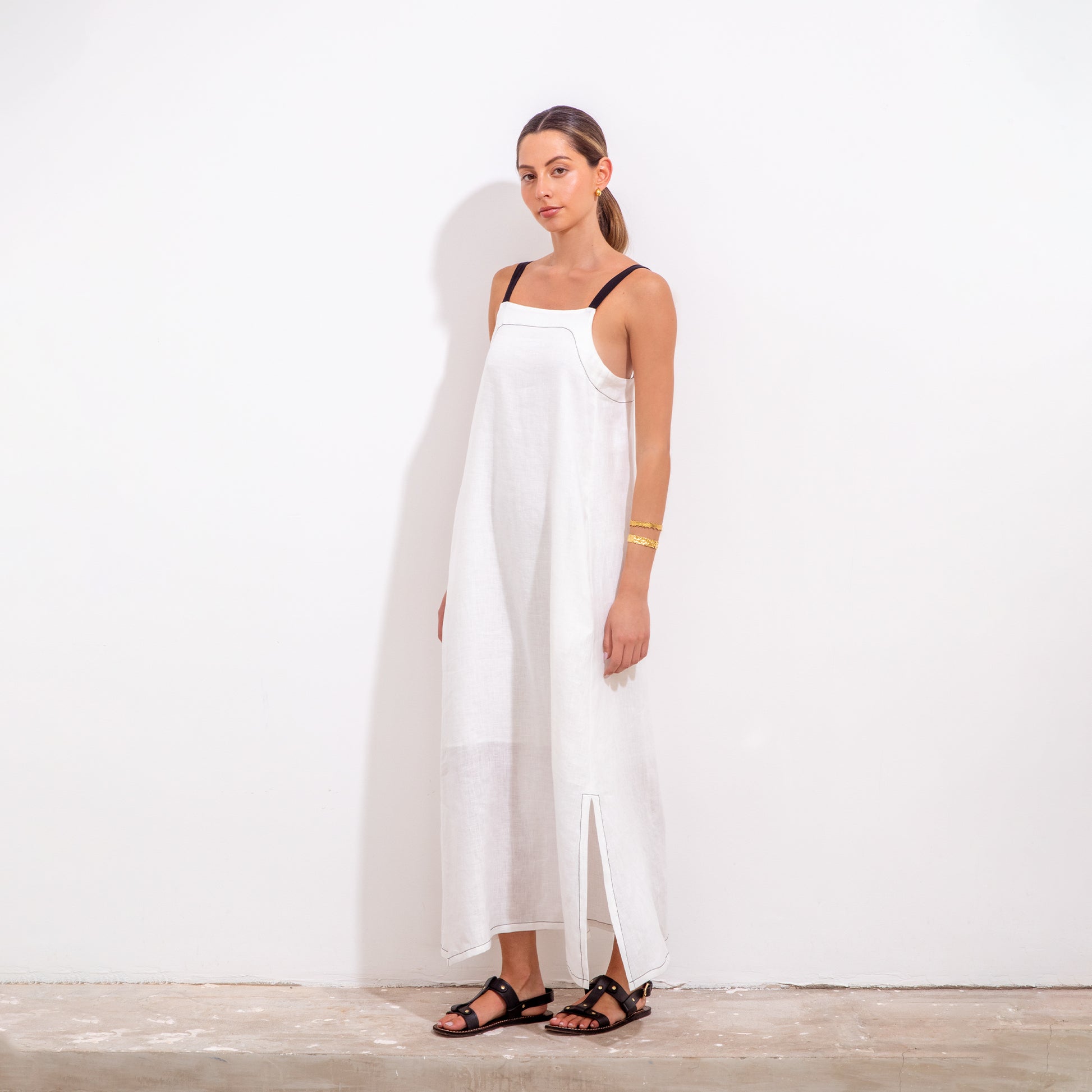 The perfect romantic meets modern style for a summer evening. Sleeveless with straps, loose skirt with side slits make it flirty yet comfy. Made of 100% linen, is one of the highlights of our summer collection.